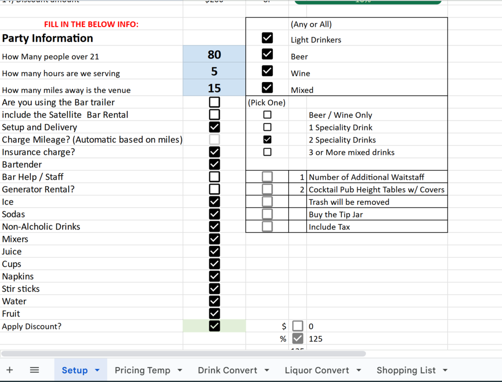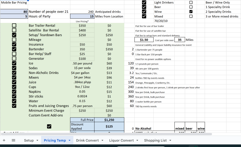 Whether you are just starting out as a dry hire mobile bar, or you’ve been in the business for a long time, this spreadsheet will help you itemize and charge appropriately for your events. This spreadsheet takes just a little information from you to set up, and in under two minutes you will be pricing out events.